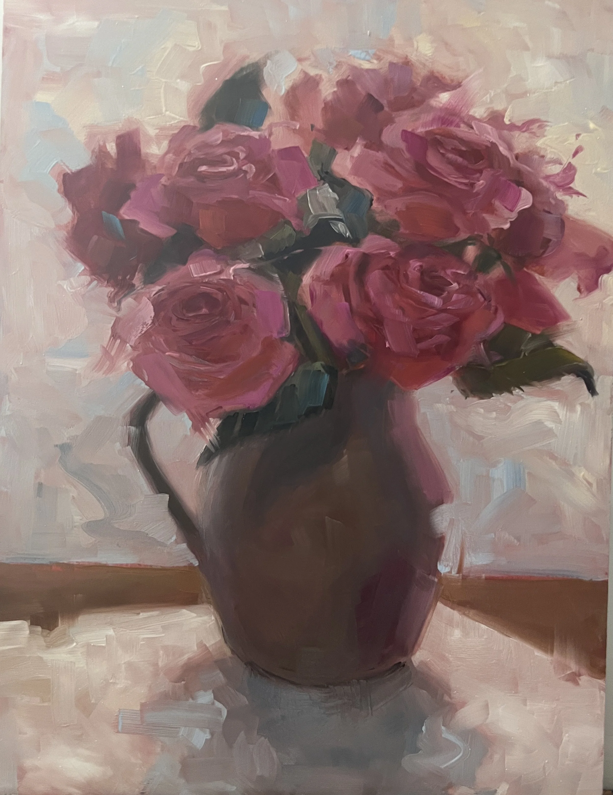 Pink Flowers on Gray (6 x 8, oil on canvas panel) $160 (framed)